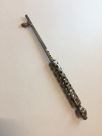 Benen haaknaaldhouder, onderdeel van handwerkgereedschap in paars fluwelen etui