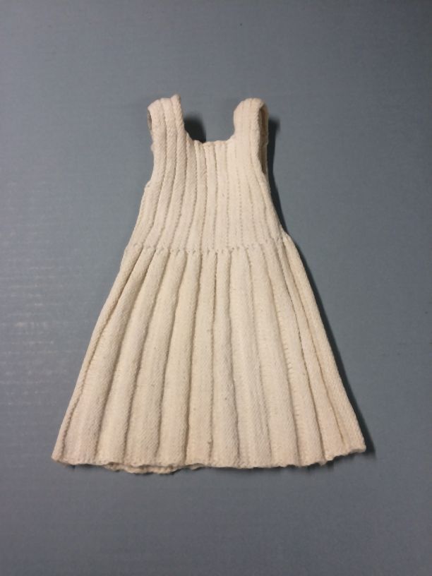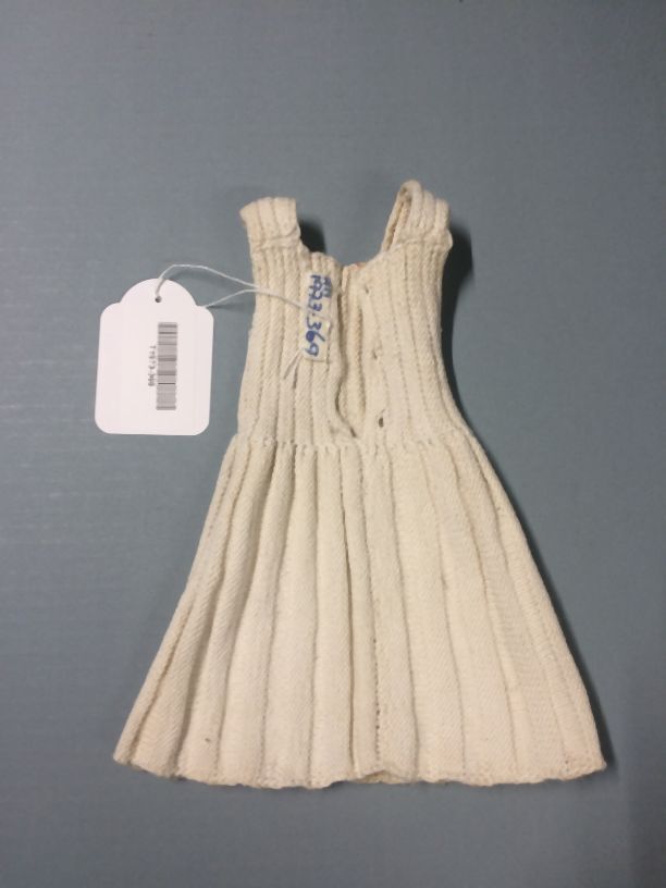 Poppenonderjurk, dwarsgebreid van wit katoen, met ribbelstrepen