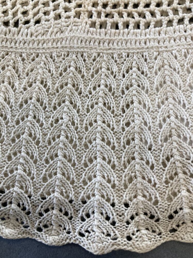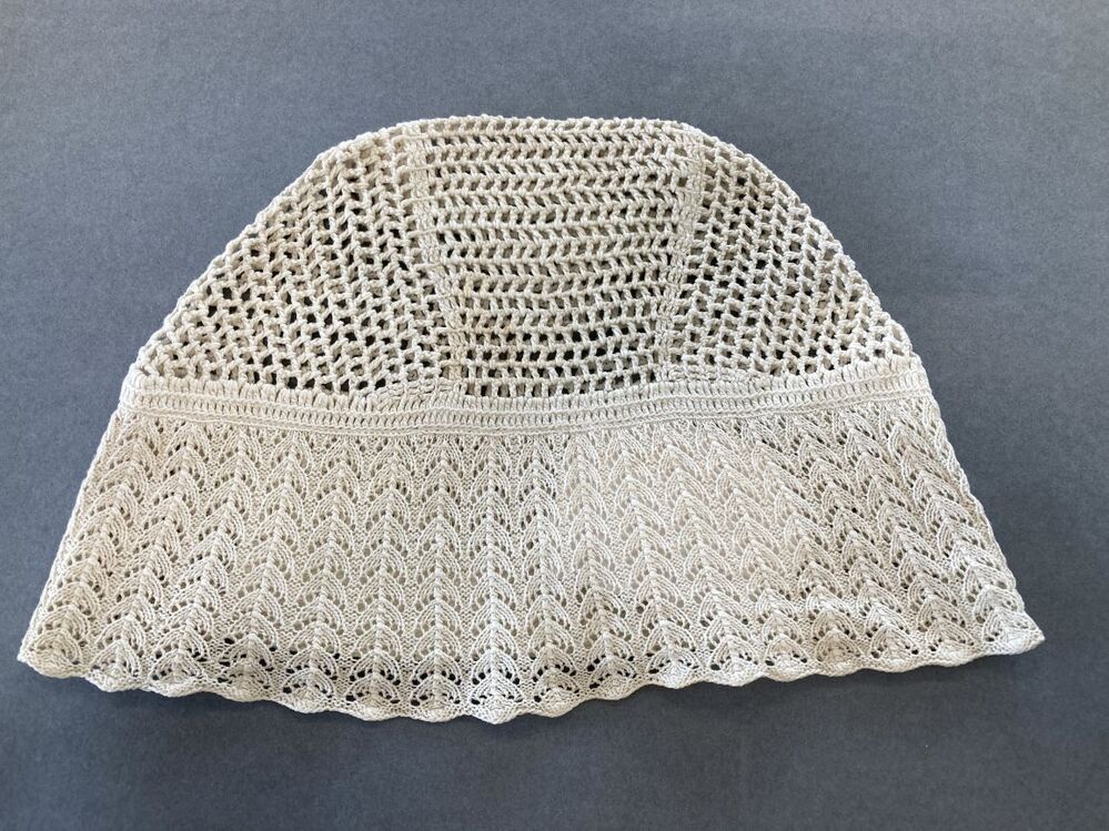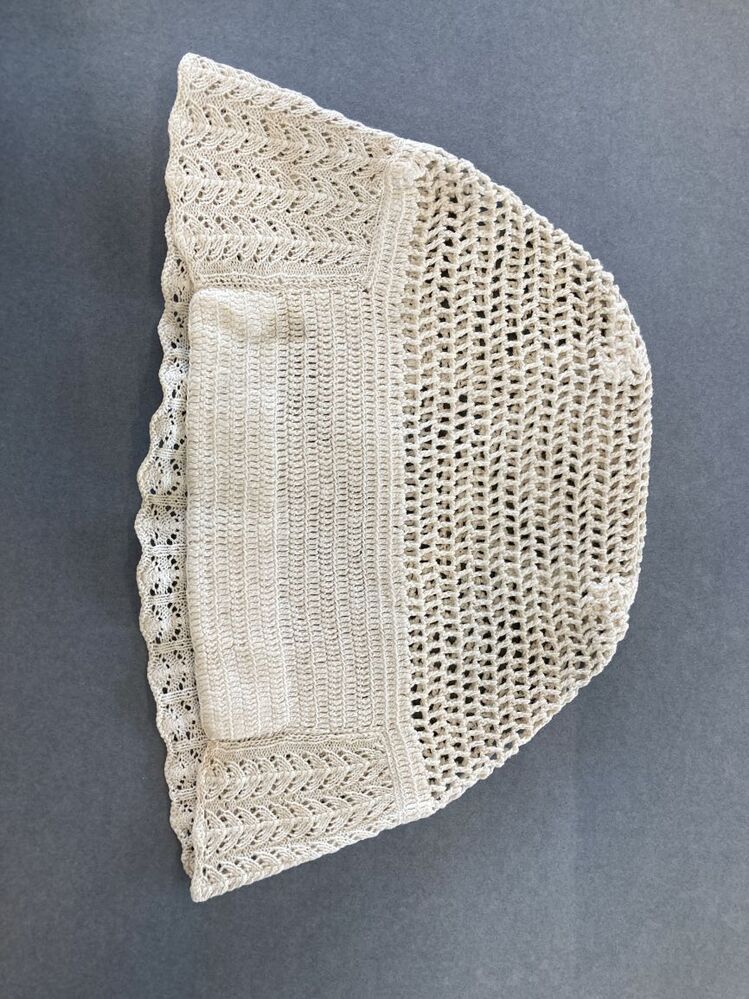 Tipmuts met gehaakte bol en gebreide strook met verticaal visgraatpatroon