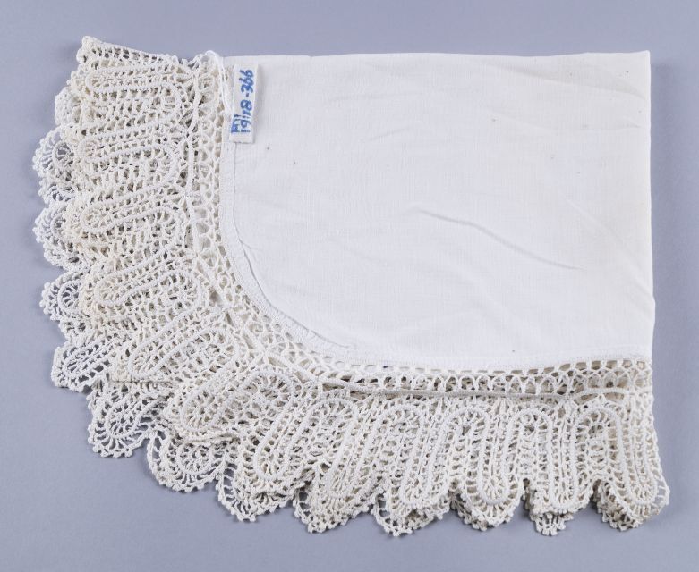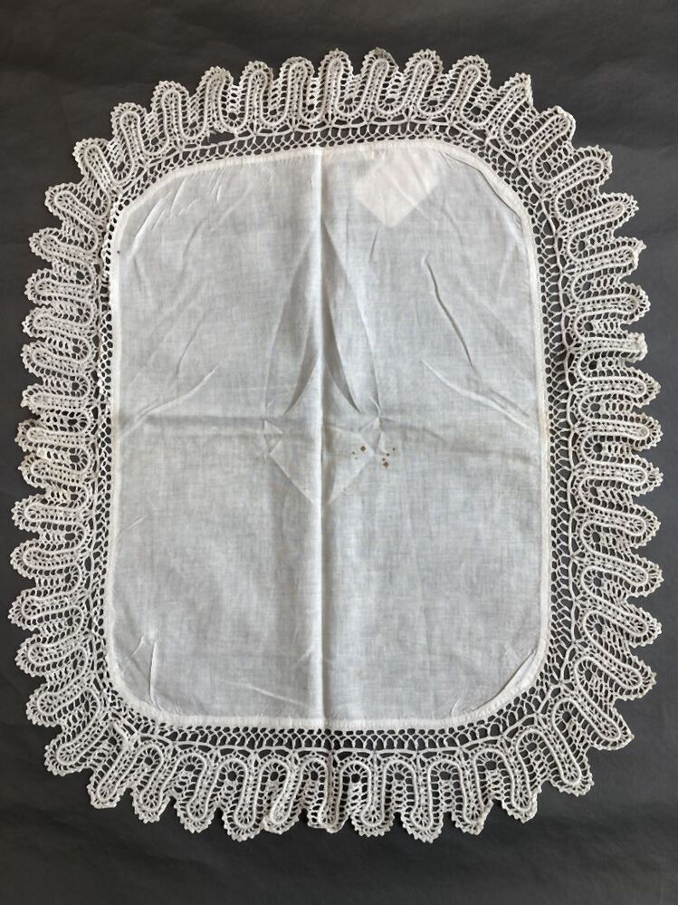Kleedje van wit katoen, langwerpig met afgeronde hoeken met brede gehaakte rand