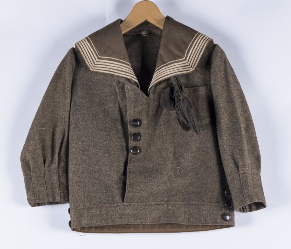 Bruin tweed wollen jasje met bruin katoenen matrozenkraag afgezet met cremekleurige biesjes
