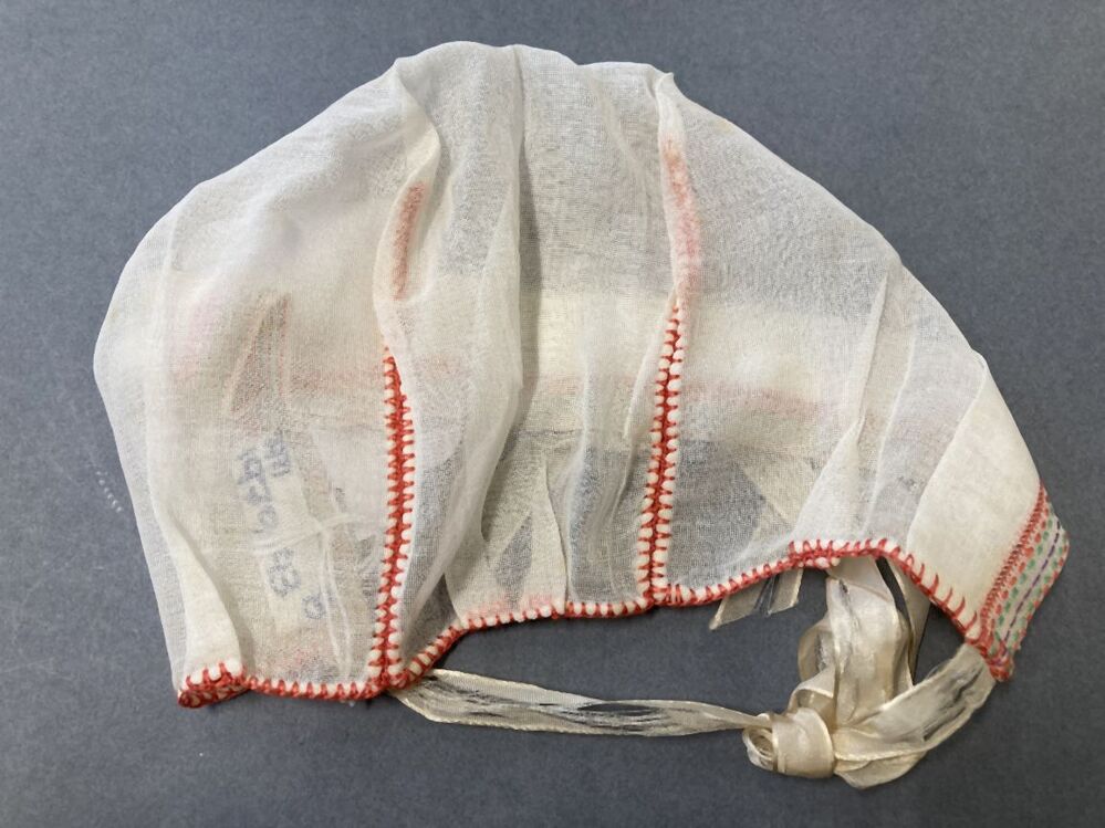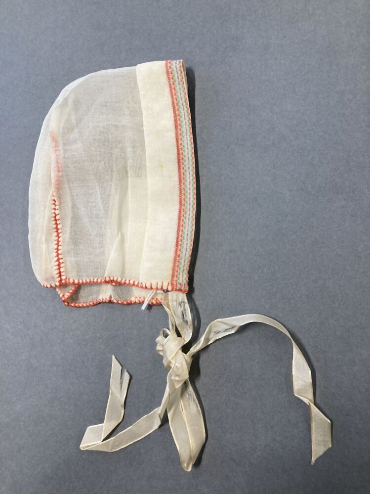Babymutsje van witte voile met borduurwerk en zijden lintje