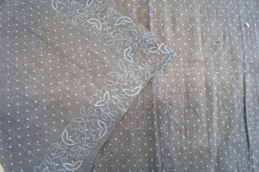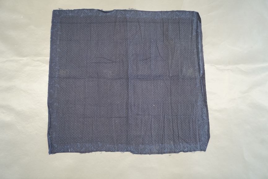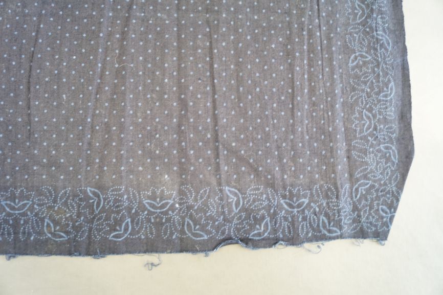 Katoenen doek of sjaal, blauwdruk, met lichtblauwe rand van gestippelde ranken en bloemkontoeren en stipjes op het middenveld
