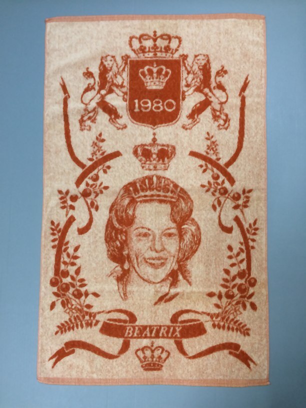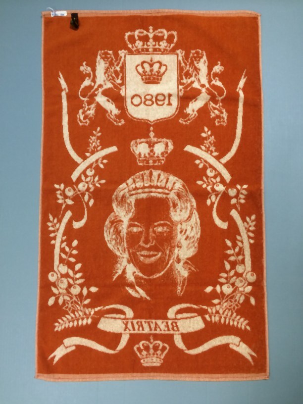 Katoenen handdoek van badstof, in de kleuren wit en oranje het lachende gezicht van Beatrix ter herinnering aan haar kroning in 1980