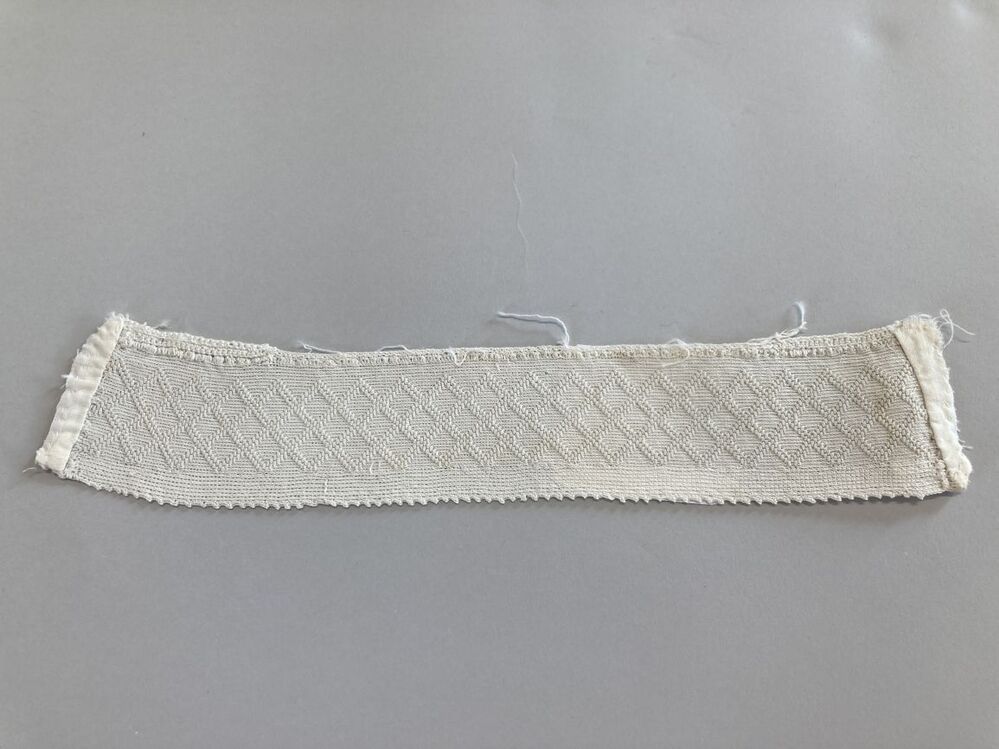 Tipmutsstrook van dun katoen, in de lengte gehaakt in reliëfstokjes,met diagonaal ruitpatroon