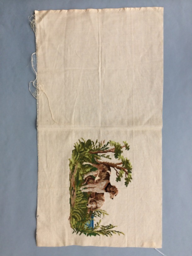 Borduurstuk op aidagaas, geborduurd in kruissteek met honden, in een landschap