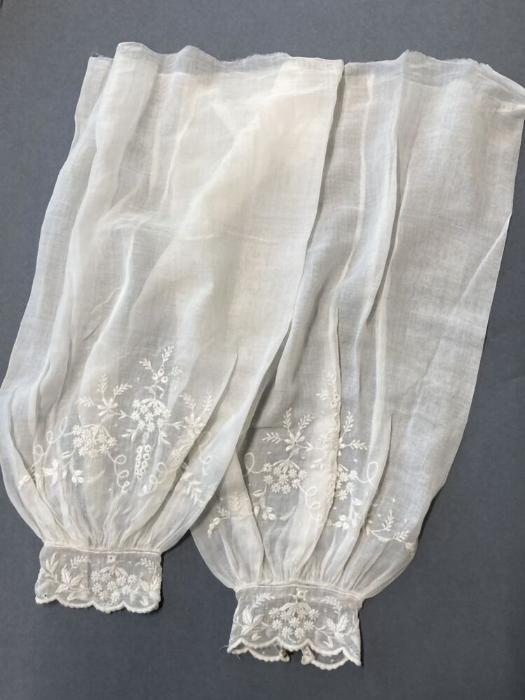 Paar wit batisten mouwtjes gerimpeld aan enkel manchetje; manchet en bovenmouw met bloemetjes, onderdeel groep accessoires bij trouwkostuum