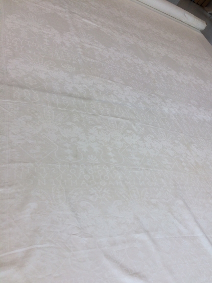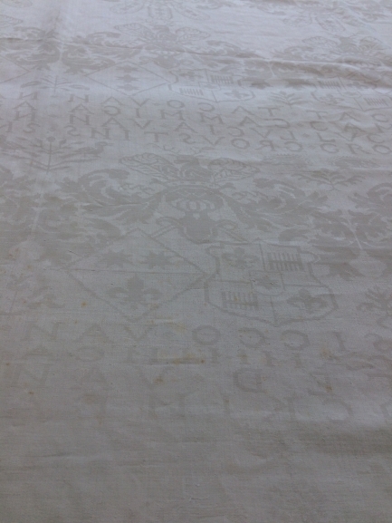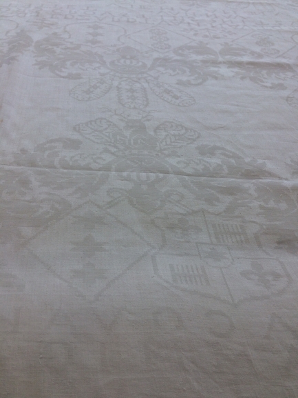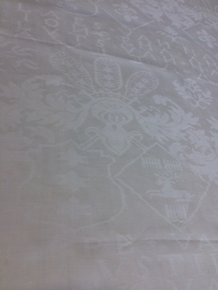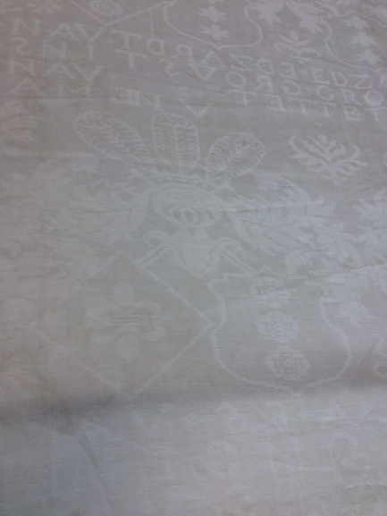 Damast tafellaken met inweving van de wapens van Cammingha, Ockinga, Grovestins en Jongema, onderdeel van groep van twaalf servetten en één tafellaken