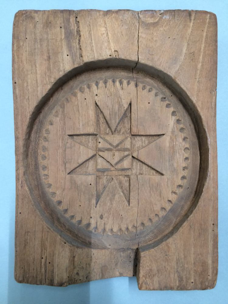 Eenzijdig besneden koekplank, in een cirkel een verhoging waarin een achtpuntige ster is gesneden