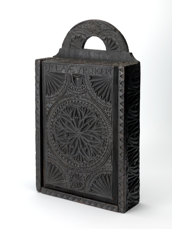 Schooltas met snijwerk en initialen Jr :L : A : Æ : V RENGERS, 1761
