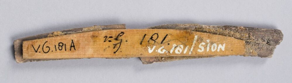 Fragment van een gebogen kam met een versiering aan de onderzijde van korte verticale inkervingen