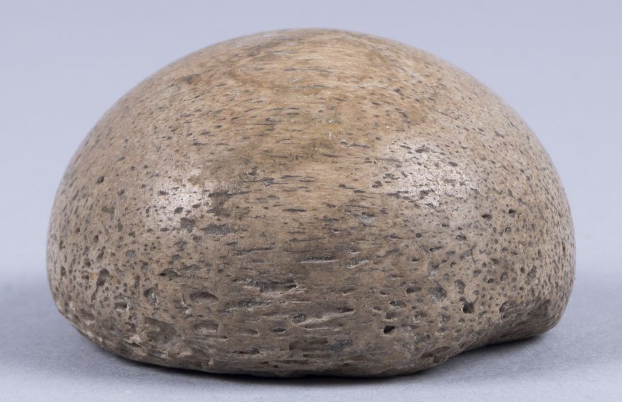 Afgedraaide half-bolvormige speelschijven met twee gaatjes in het platte vlak