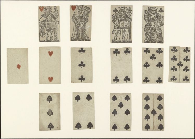 Kaarten die worden gemaakt in pakketten van een bepaald aantal en die zijn gemerkt om te worden gebruikt als spelonderdelen tijdens het spel; de merktekens of ontwerpen kunnen een bepaald kleur- of rangensysteem volgen of speciaal en meer specifiek zijn. (AAT-Ned)