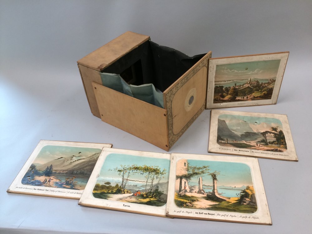 Kijkdoos van hout en karton met zes platen met voorstellingen van landschappen