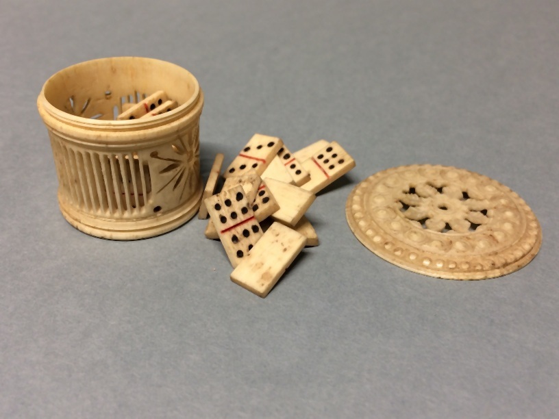 Miniatuur dominospel van been in benen getralied cylindervormig doosje