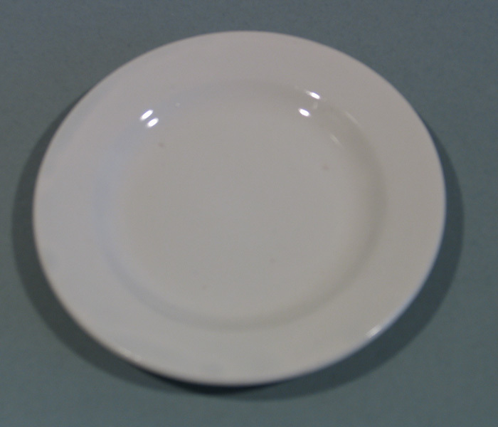 Plat bord, wit, van speelgoedservies. Nummers 0055 t/m 0066 en 0100 behoren waarschijnlijk tot hetzelfde eetservies.