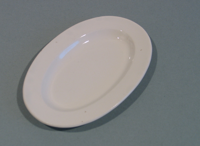 Platte ovale schaal, wit, van speelgoedservies. Nummers 0055 t/m 0066 en 0100 behoren waarschijnlijk tot hetzelfde eetservies.