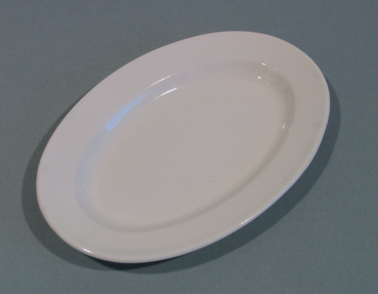 Platte ovale schaal, wit, van speelgoedservies. Nummers 0055 t/m 0066 en 0100 behoren waarschijnlijk tot hetzelfde eetservies.