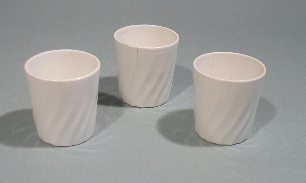 Wiite drinkbeker van speelgoedservies, voorzien van decoratie in relief.
