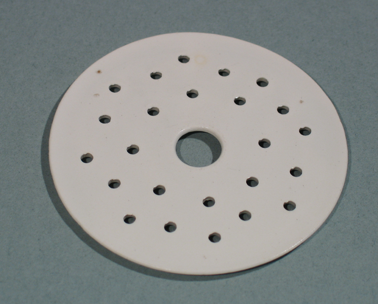 Ronde witte plaat voorzien van gaatjes, vermoedelijk van een theelicht, van speelgoedservies.