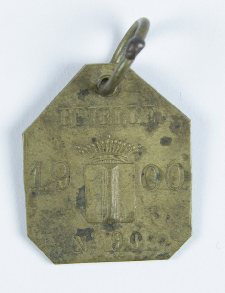 Hondenbelastingpenning, achthoekig, metaal, met opschrift op voorzijde: 'BRIELLE / 1900 / No 90' met het wapen van Brielle. Keerzijde is blanco. Bovenin de penning een gaatje met ophangoog.
