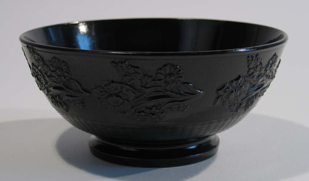 Kom of schaal, zijnde een spoelkom van zwart rouwservies, voorzien van bloemdecoratie in reliëf.