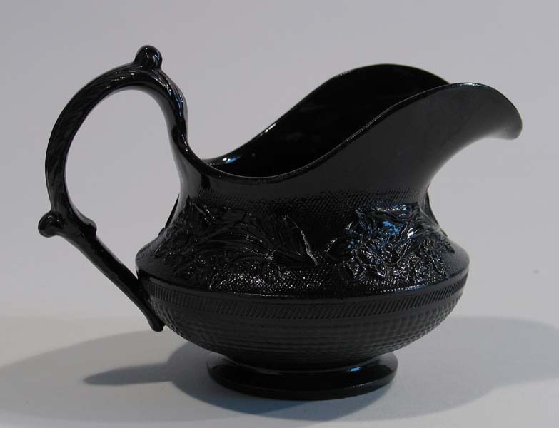 Melkkan van zwart rouwservies, voorzien van bloemdecoratie in reliëf. Oor in voluutvorm met acanthusblad.
