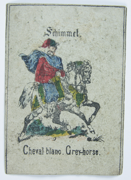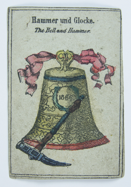 Set speelkaarten, vijf, behorende bij klok- en hamerspel. Op de kaarten voorstellingen van klok met hamer, hamer aan ketting onder poort, man op paard, klok met linten en portret van man in medaillon. Op de kaarten verschillende opschriften.