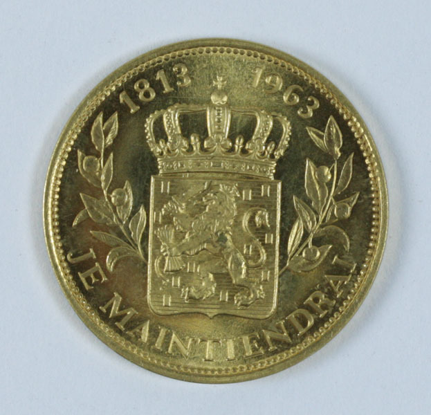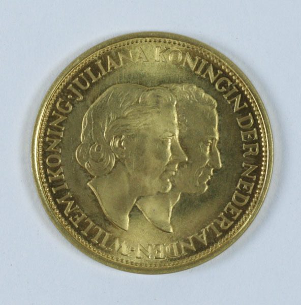 Gouden gedenkpenning met op de voorzijde de portretten van koning Willem I en koningin Juliana. Op de keerzijde het rijkswapen.