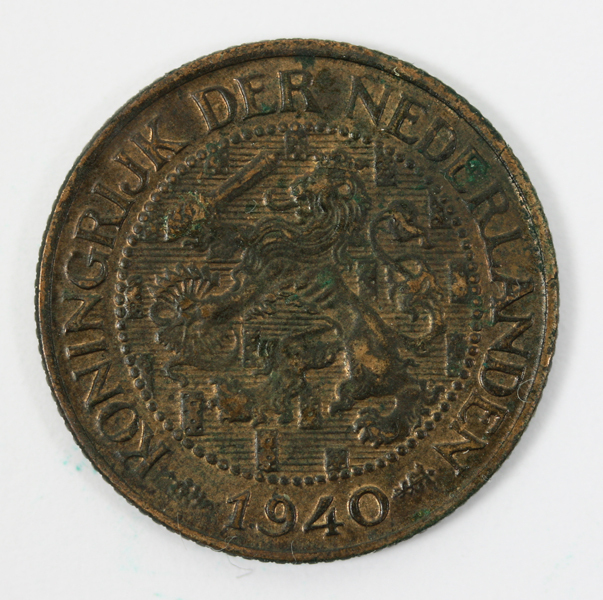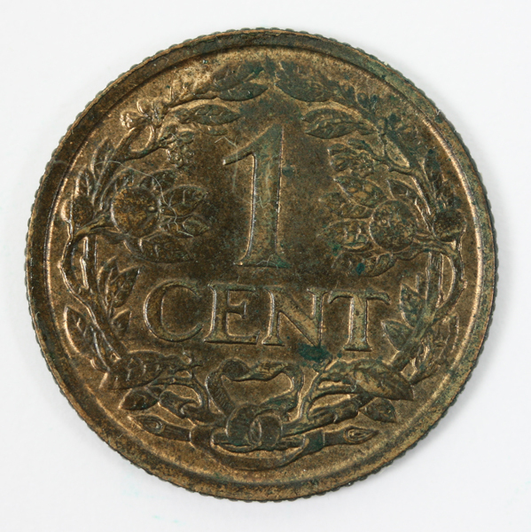 Cent uit de regeringsperiode van koningin Wilhelmina. Op de voorzijde de gekroonde leeuw met zwaard en pijlenbundel in een veld met blokken. Op de keerzijde de waarde binnen twee samengebonden oranjetakken.