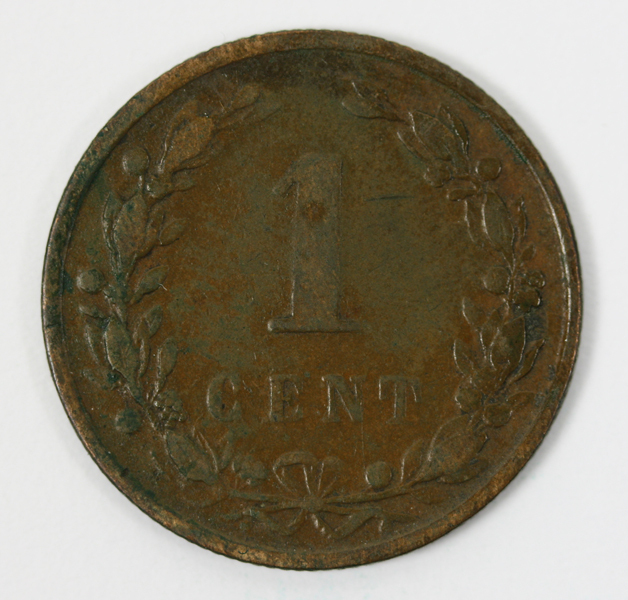 Cent uit de regeringsperiode van koningin Wilhelmina. Op de voorzijde de gekroonde leeuw met zwaard en pijlenbundel in een veld met blokken. Op de keerzijde de waarde binnen twee samengebonden oranjetakken.