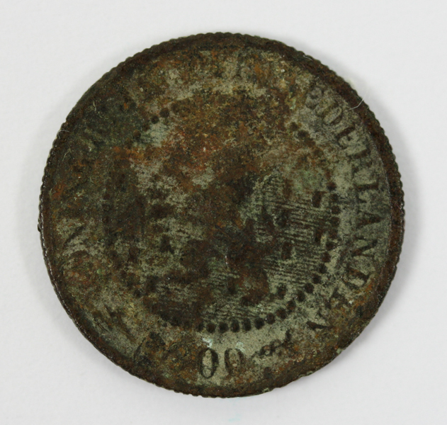 Halve cent uit de regeringsperiode van koningin Wilhelmina. Op de voorzijde een gekroonde leeuw met zwaard en pijlenbundel op een veld met blokken en het jaartal. Op de keerzijde de waarde binnen twee samengebonden oranjetakken.