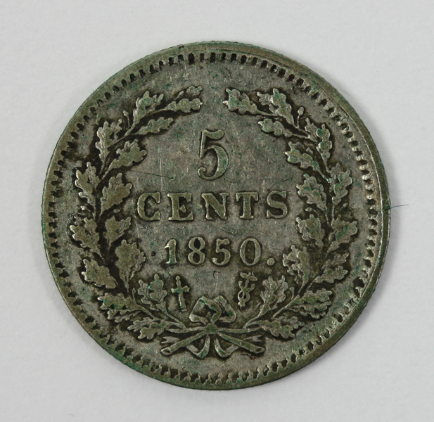 Stuiver uit de regeringsperiode van koning Willem III. Op de voorzijde zijn portret met naar rechts gewend gezicht. Op de keerzijde de waarde binnen twee samengebonden eikentakken.