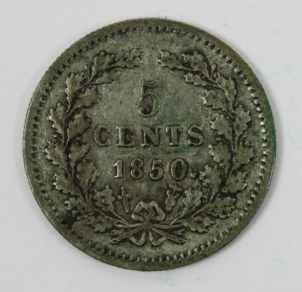 Stuiver uit de regeringsperiode van koning Willem III. Op de voorzijde zijn portret met naar rechts gewend gezicht. Op de keerzijde de waarde binnen twee samengebonden eikentakken.