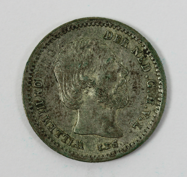 Stuiver uit de regeringsperiode van koning Willem III. Op de voorzijde zijn portret met naar rechts gewend gezicht. Op de keerzijde de waarde binnen twee samengebonden eikentakken.