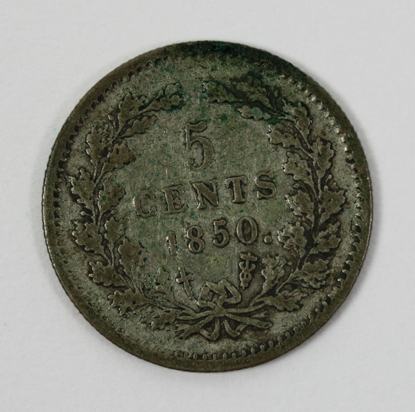 Stuiver uit de regeringsperiode van koning Willem III. Op de voorzijde zijn portret met naar rechts gewend gezicht. Op de keerzijde de waarde binnen twee samengebonden eikentakken.