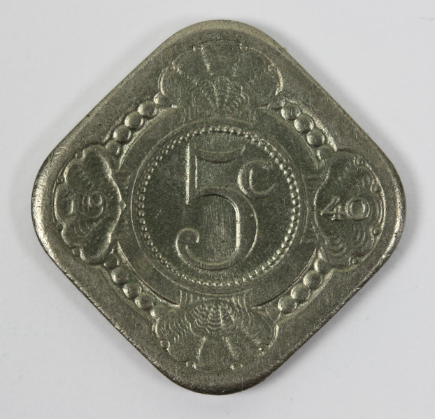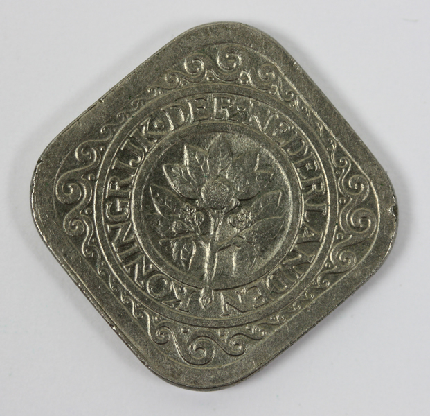 Vierkante stuiver uit de regeringsperiode van Willhelmina. Op de voorzijde een vruchtdragende oranjetak en een rondschrift. Op de keerzijde de waarde binnen een parelrand met schelpen en het jaartal.