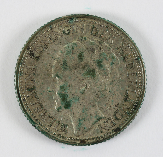 Kwartje uit de regeringsperiode van koningin Wilhelmina. Op de voorzijde haar portret met naar links gewend gezicht en opgestoken haar.Op de keerzijde de waarde binnen twee samengebonden eiketakken.