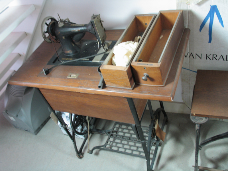 Trapnaaimachine, polychroom beschilderd met bloemmotief, inklapbaar, in houten ombouw, waarop een maatverdeling in cm en inches. Op naaimachine een elektrisch lampje. Met losse onderdelen bestaande uit een spoel, zeven garenspoelen, afdekplaat, twee lades en vijftien hulpmiddelen.