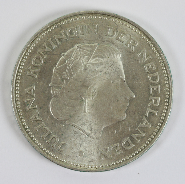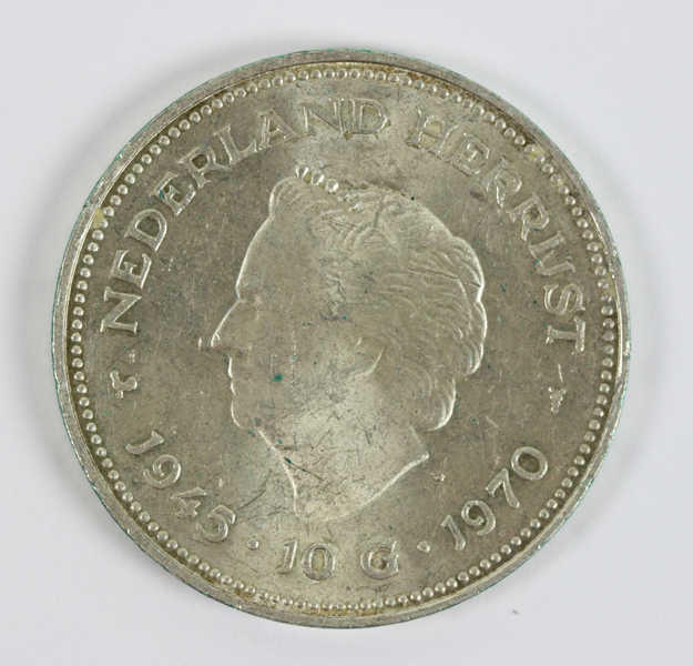 Zilveren tientje uit de regeringsperiode van koningin Juliana. Op de voorzijde haar portret met naar rechts gewend gezicht. Op de keerzijde het portret van koningin Wilhelmina met naar links gewend gezicht.