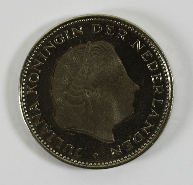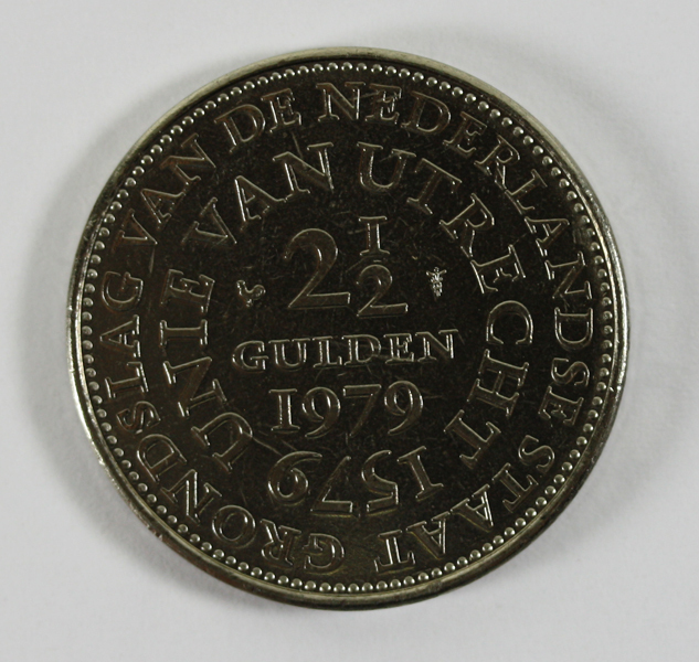 Rijksdaalder uit de regeringsperiode van koningin Juliana. Op de voorzijde haar portret met naar rechts gewend gezicht. Op de keerzijde een opschrift over de Unie van Utrecht.