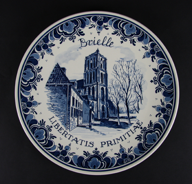 Delfts blauw sierbord. Met afbeelding van de St. Catharijnekerk te Brielle en het opschrift Libertatis primitiae.