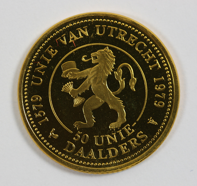 Gouden gedenkpenning. Op de voorzijde de Hollandse leeuw met vrijheidshoed en pijlenbundel met rondschrift en de waarde. Op de keerzijde een gekroond wapenschild binnen een rondschrift.