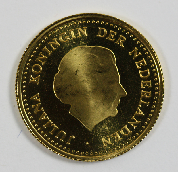 Gouden 50 gulden munt voor de Nederlandse Antillen uit de regeringsperiode van koningin Juliana. Op de voorzijde haar portret met naar rechts gewend gezicht. Op de keerzijde de gekroonde wapens van Nederland en de Nederlandse Antillen en de waarde.