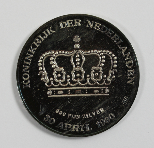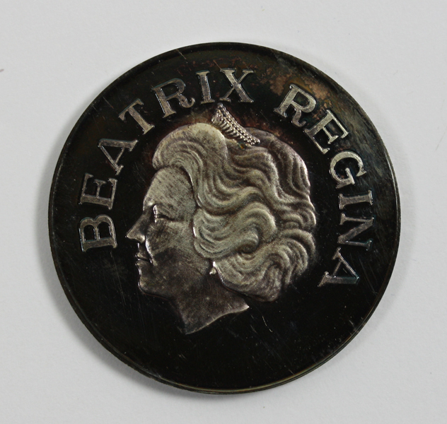 Gedenkpenning. Op de voorzijde een portret van Beatrix met naar links gewend gezicht. Op de keerzijde een afbeelding van een kroon en een rondschrift. De penning is donker aangeslagen.