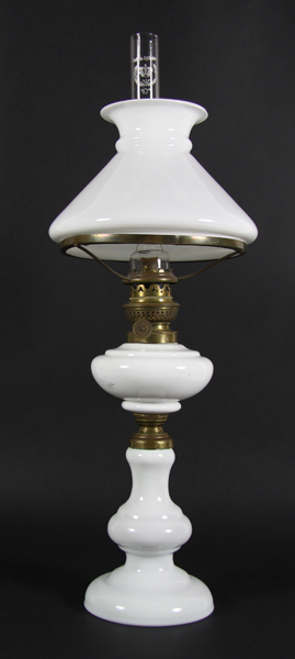 Olielamp, bestaande uit zes delen: een aardewerken voet en reservoir, verbonden door een koperen verbindingsstuk met schroefdraad, een koperen lonthouder, brander en lampenkapframe, een glas en een lampenkap.