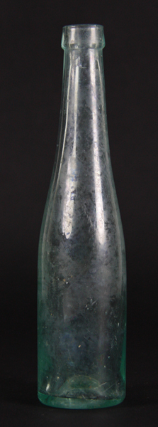 Fles, cylindervormig met smal toelopende hals en bodem die aan de binnenzijde toeloopt.