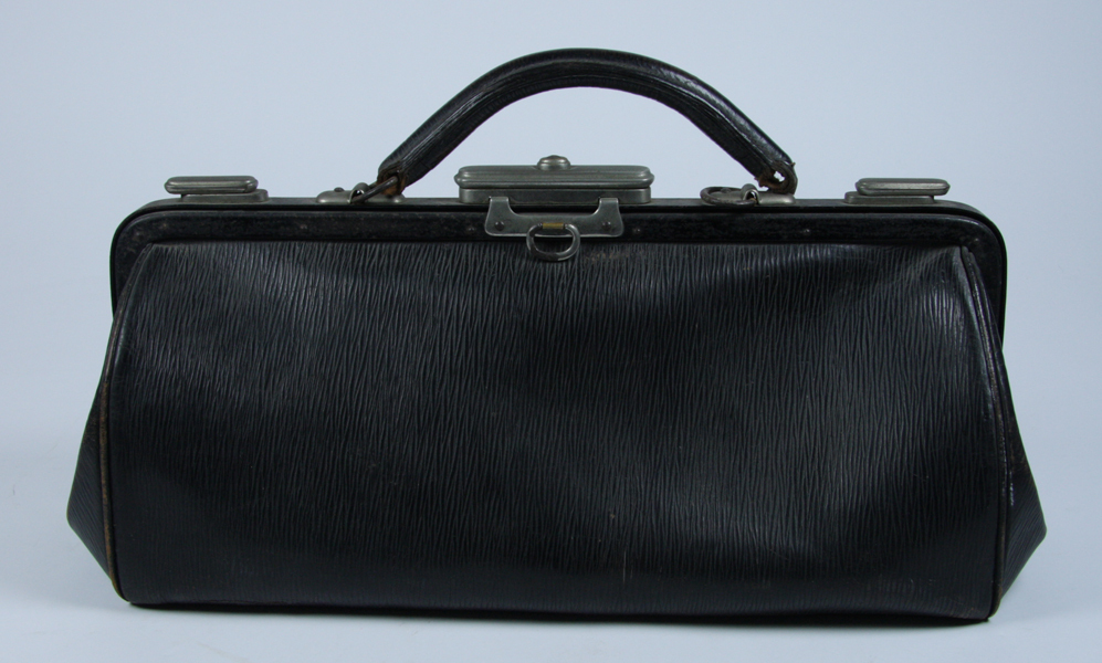 Handtas, langwerpig, zwart, met gelakte beugel, vernikkelde klemsluitingen, slot, en leren handvat. Zogenaamde citybag.