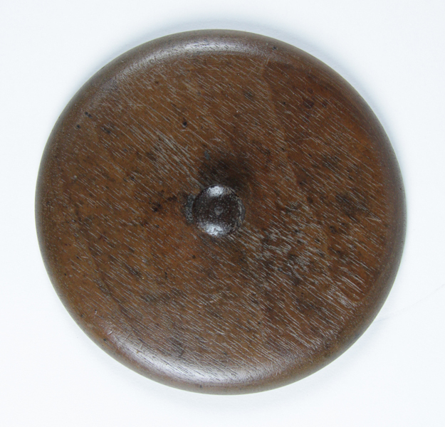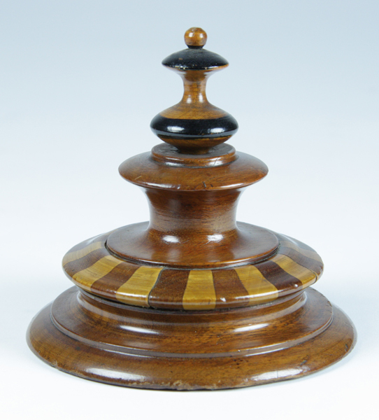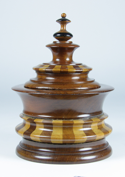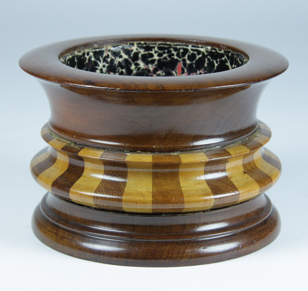 Tabakspot. Rond, licht- en donkerbruin, zwart en rood. Met gedraaide horizontale ribbels en ingelegde houten band in het midden. Binnenzijde beplakt met gemarmerd papier. Met deksel en aromadeksel.