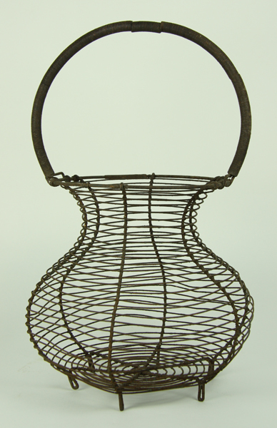 Eiermand van metaaldraad. Op zes poten en met booghengsel, bolle buik, smalle hals en wijde opening.